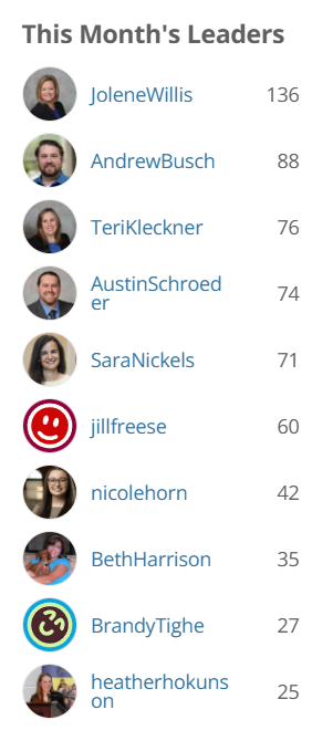 Congrats to our Top 10 community members who lit up Compass with their engagement and dedication throughout September! Let's give a round of applause to: @JoleneWillis, @AndrewBusch, @TeriKleckner, @AustinSchroeder, @SaraNickels, @jillfreese, @nicolehorn, @BethHarrison, @BrandyTighe, and @heatherhokunson! These 10 members earned a total of 636 points in the month of September!